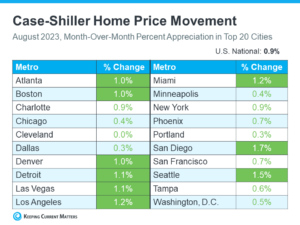 After seeing steady home price growth at the national level for the last several months, you may wonder if prices are going up in your local area, too. Know this: while this will vary from one area to the next, home prices are appreciating in these top cities Case-Shiller reports on in their monthly price index (see chart below):